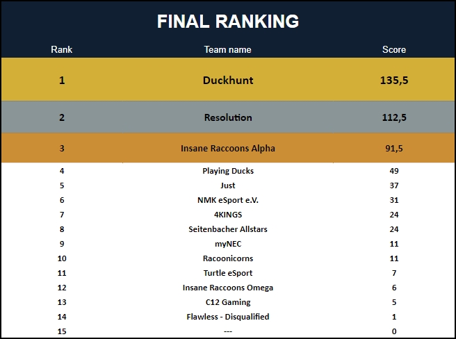 Die Platzierungen ergeben sich durch die Gesamtpunktzahl der Teams, welche durch Kills und Platzierung in den Spielrunden ergeben.